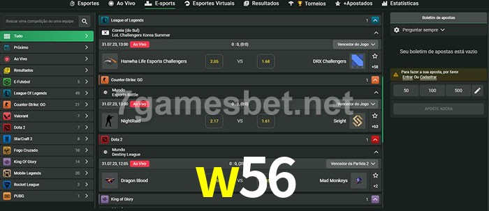 O w56 oferece uma grande seleção de opções de apostas em e-sports com probabilidades competitivas